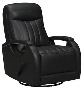 Modern open track arm design, 360-degree swivel glider recliner with handle activated recline. 4” channels on the seat & back, pad over chaise seating with pocketed coil springs, and plushily padded headrest and footrest for outstanding reclining comfort. Chrome accents under the arm pads and single needle top stitching thru out.Read More