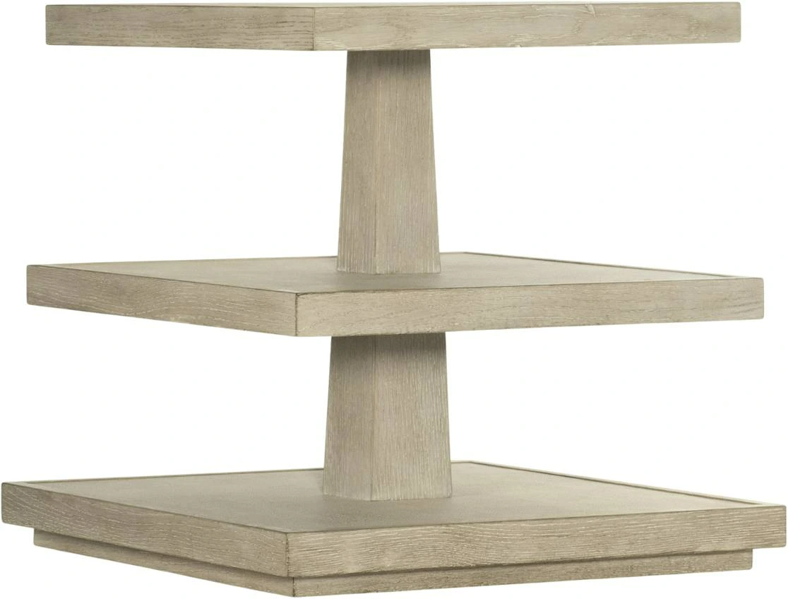 This 3-tiered, square-shaped end table in a soft taupe finish on lacquered burlap and oak veneers with dry-brushing has a tactile texture and organic chic appeal. The tiers can be used as shelves for display or storage.Read More