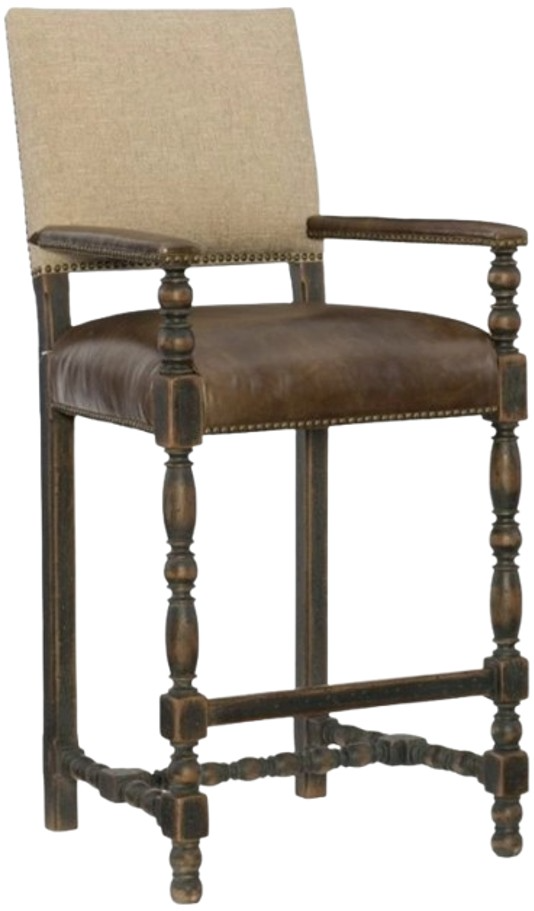 You'll want to linger and gather for hours around your bar or pub table in the inviting Comfort Barstool. The seat is upholstered in an aniline top grain leather, and the back is in a woven, desert-colored fabric, and both are accented with bronze nailhead trim. The bobbin-style stretchers and legs add authenticity.Read More