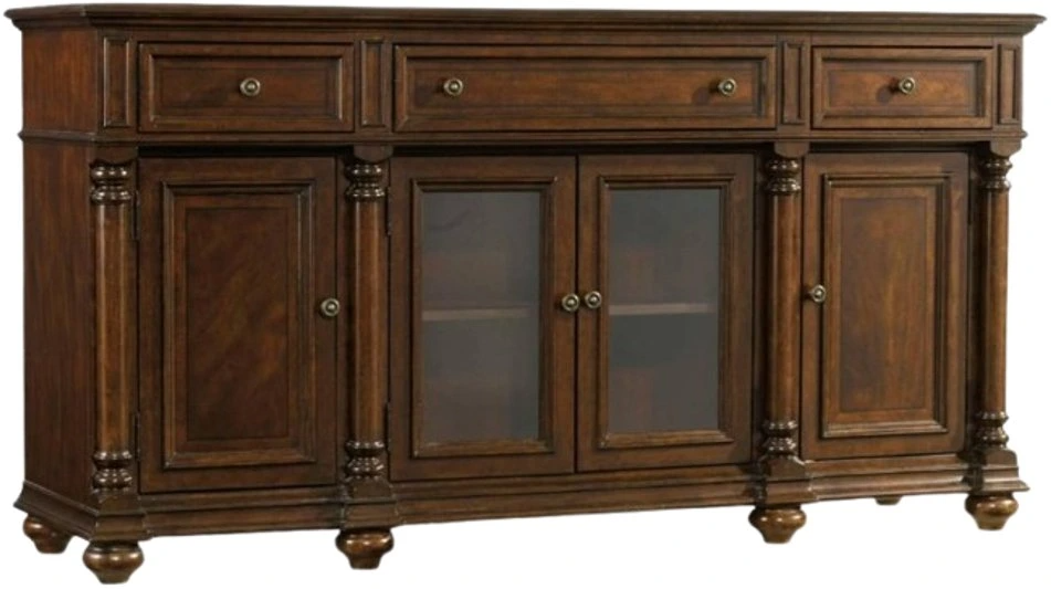 Set a tone of gracious hospitality with the striking Leesburg buffet. Featuring classical design motifs with a fashionable flair, the functional piece has 3-drawers with a felt liner in the right drawer and a silverware tray liner in the center drawer. The wood-framed beveled glass center doors each have a wood shelf behind.Read More