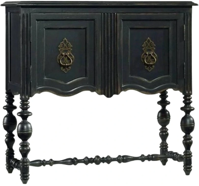 With a vintage charm, the black hand-painted leg chest with rub-though is nostalgic and timeless with turned legs and a stretcher, a shaped base and ring pulls on decorative back plates. Two doors with one adjustable shelf. Looking for the perfect piece of jewelry for your room? Look no further than Hooker's line of accents.Read More