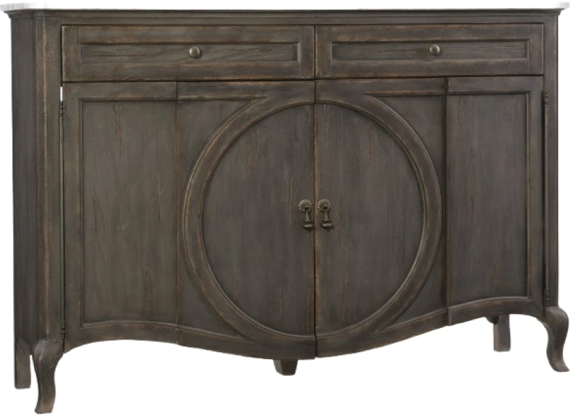 This chic and shapely credenza has a raised circle motif that dissects the center doors, classic cabriole legs and an elegant marble top. Almost too good to be true: this gorgeous piece is TV-ready with a ventilated back panel, two adjustable shelves and two drawers and will accommodate up to a 60-inch flat screen TV.Read More