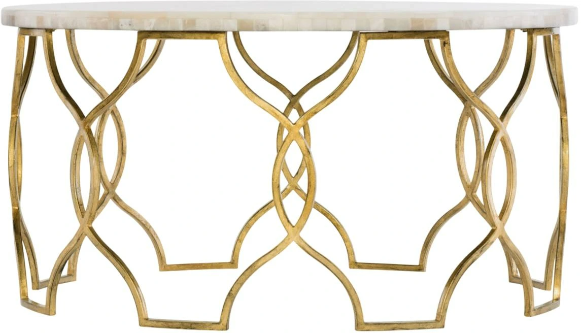 Light and airy, sleek and chic, the Corrina cocktail table is distinguished by a delicate fretwork metal base in a gold leaf finish topped by a round white onyx top of organic elegance. Come closer to Melange, and you will discover an eclectic blending of colors, textures and materials in a vibrant collection of one-of-a-kind artistic pieces.Read More