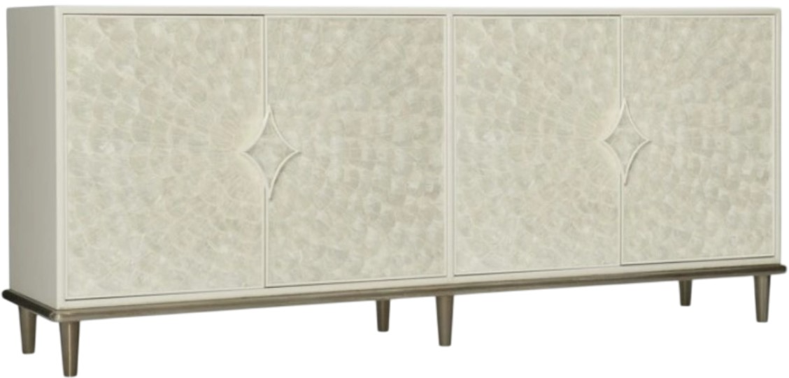 A creamy white finish with a subtle shimmer combines with Capiz shell inlay and a silver-colored metal base and feet for a stylish focal point designer piece that also accommodates up to a 75-inch TV. The four wood-framed doors with Capiz shell inlay have soft-close hinges and one drawer behind each door.Read More