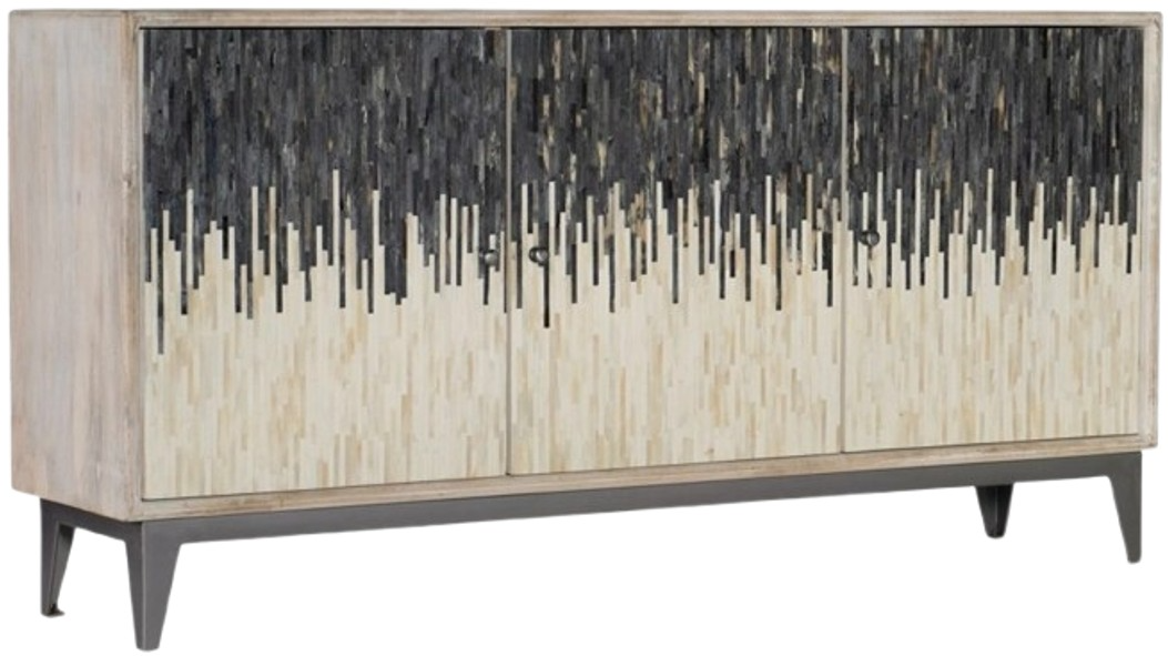 With a modern art vibe, this three-door console is crafted of mango wood with contrasting gray and bone door fronts. The outside of the case is in a rustic light finish, accented by matte zinc metal knobs and iron base. There’s one removable shelf behind each door and a ventilated back panel.Read More