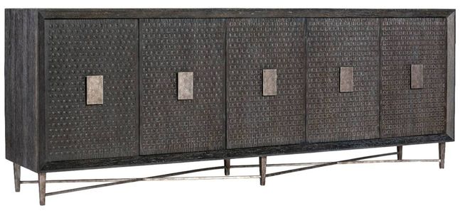An unexpected eclectic blending of texture, form, and function with an understated and timeless beauty, the Mélange Keenan 5-door credenza combines a weave-like tactile surface with a shaped silver metal base and distressed metal hardware in an oversized rectangle shape.Read More