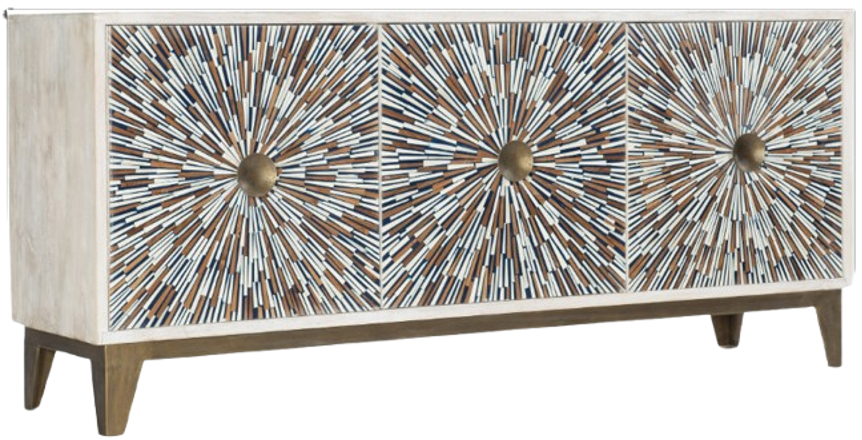 Create an atmosphere of celebration every day with the uplifting Liberty entertainment console, featuring a festive starburst bone inlay pattern in colors of white and blue, and brown. Gold provides a sparkling accent color on the metal base and hardware.Read More