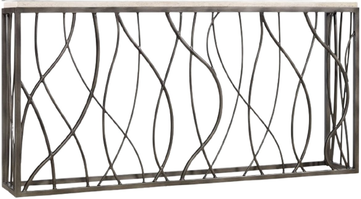 Organic and modern, this striking console table in a neutral color palette has a curvy steel base and natural stone top of Travertine Marble to create an inviting focal point. The 5373 living room tables feature a curved steel base with travertine marble tops.Read More
