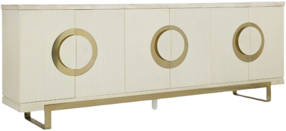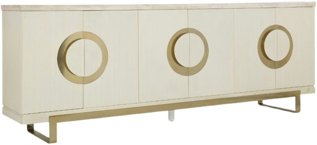 Serene and stylish, the Noelle Credenza sets a relaxing and refined tone for any space. The wood credenza has a cream finish with dramatic gold round pulls and base, and a white marble top. Accommodating up to an 80-inch TV.Read More