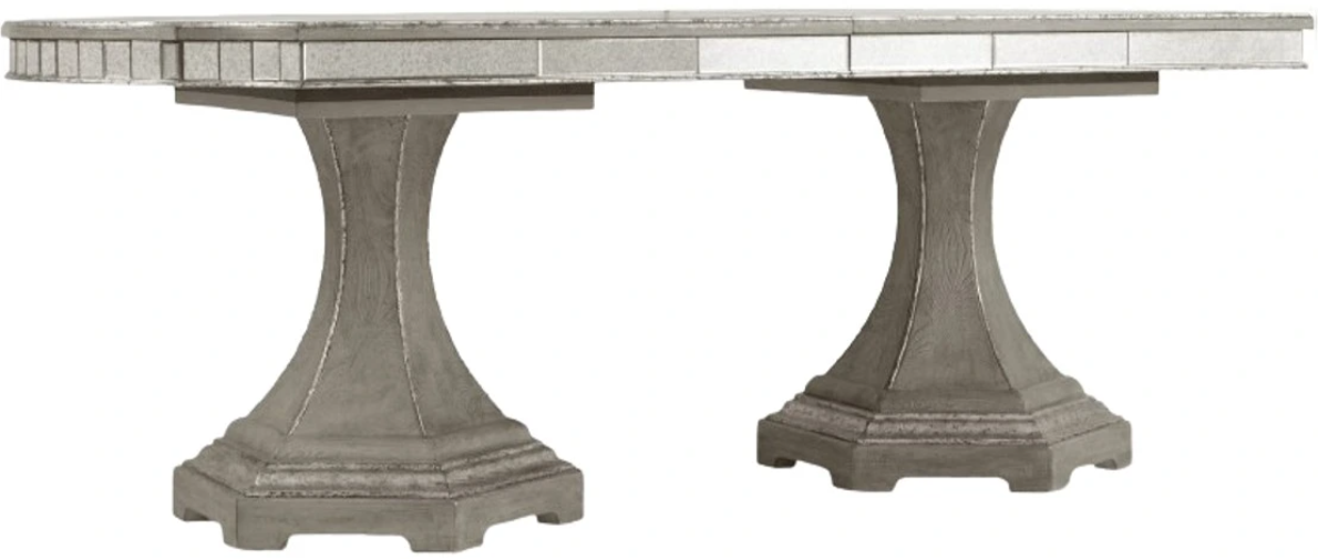 Make every dining gathering a luxe experience with this opulent dining table featuring exquisite scrolled inlays on the top and a mirrored apron. Finished in epoque, a greige with shimmer on oak veneers with mirrored accents. Seats 10 guests and extends to 128 inches with both leaves in place.Read More