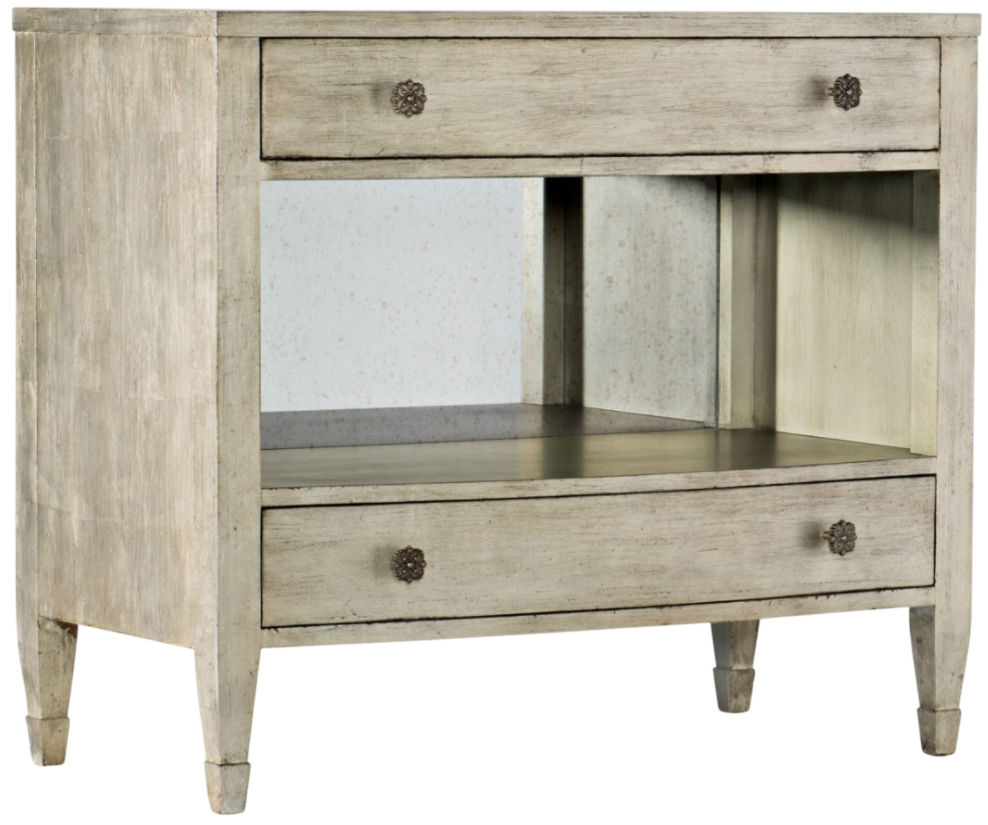 With a luxurious platinum patina and shimmery eglomise back panel, the Sanctuary Gemme two-drawer nightstand is refined and ever-so-tasteful. Delightfully functional, the nightstand includes a power bar with 3 electrical outlets and one live usb port. The top drawer has a removable cream-colored felt liner, while the bottom drawer creates a fixed shelf.Read More