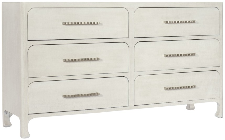 Inspired by casual waterfront living with a chic sophistication, the Serenity dresser is crafted of wood and raffia and finished in sand dollar, a white lacquered grass cloth. Chow-style legs and light champagne-colored decorative bar pulls add a designer touch.Read More