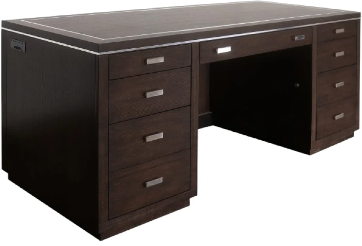 In a Dark Roast finish over Quartered Ash Veneers with silver metal trim and polished stainless bar pulls, the sleek and stylish House Blend Desk will inspire your best work. Loaded with function, the desk has 7 drawers, with the top left and right drawers on full extension metal ball bearing slides with removable divider inserts. There’s one removable writing slide and one removable pencil drop-in that can be used on either side. The bottom drawers are locking file drawers with a pendaflex filing system. Finished on all sides so the desk can float in the room.