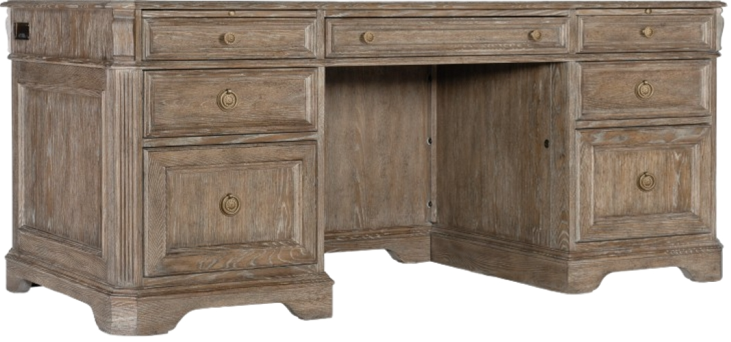 Traditional with a twist, the Sutter executive desk is crafted of cathedral oak veneers with a classic silhouette and designer details such as a shaped base and champagne-colored knobs and ring pulls. The claro finish is a casual clear oak color that reveals the tactile grain pattern for a reclaimed look.Read More