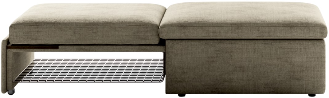 This sleeper ottoman uses the multifunctional operation to offer a small coffee table when the drawer is opened to its first position. Pulling it all the way open, you can retrieve the stowed cushion, set it on top and sleep on a cot size bed.Read More