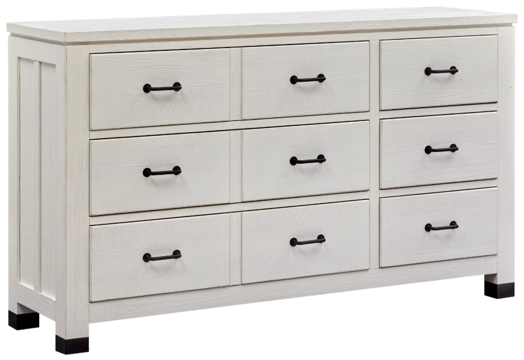 Black metal ferrules, corner brackets and forged iron hardware bring an industrial modern vibe to the craftsmen-like silhouettes. A black metal bed and a black mirror with window-pane border provide a dramatic contrast to the soft Silo White finish with rub-through and distressing. Harper Springs is crafted of random-width solid Pine for an authentic and casual feel. Whether you aspire to loft living or country living, the Harper Springs Collection will bring your dream home to life.