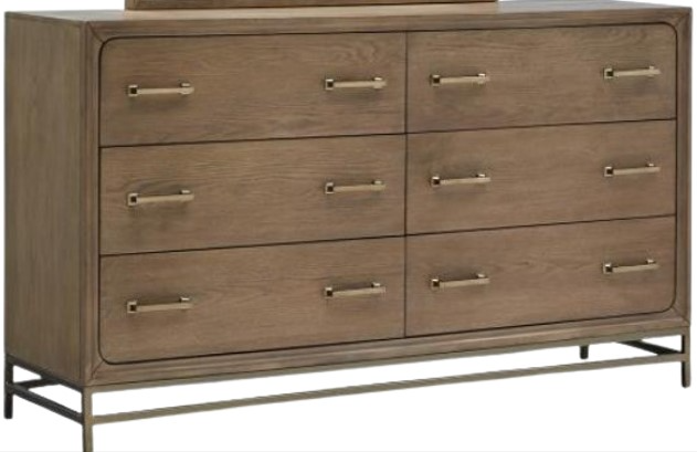The coordinating casegoods in this group convey Lindon’s streamlined personality while design details such as open metal bases tie all the pieces together. Alluring finishes of Belgian Wheat and Coffee Bean highlight the group’s random Cathedral/ Quartered Knotty White Oak veneers and hardwood solids. Burnished Brass hardware adds a finishing touch to this expressive bedroom collection.