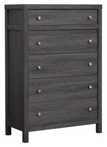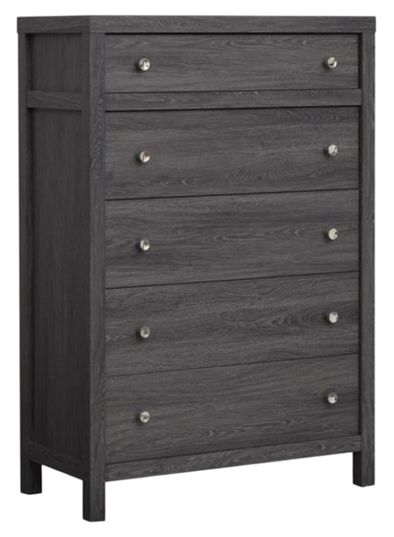 The Merrifield collection boasts a bold Raisin black finish, with rich undertones that mimic the texture of oak veneer, paired with sleek polished silver hardware to elevate its modern appeal. The casegoods feature minimalist lines and a sophisticated multi-dimensional finish, creating a clean, contemporary look that blends effortlessly into any modern bedroom.Read More