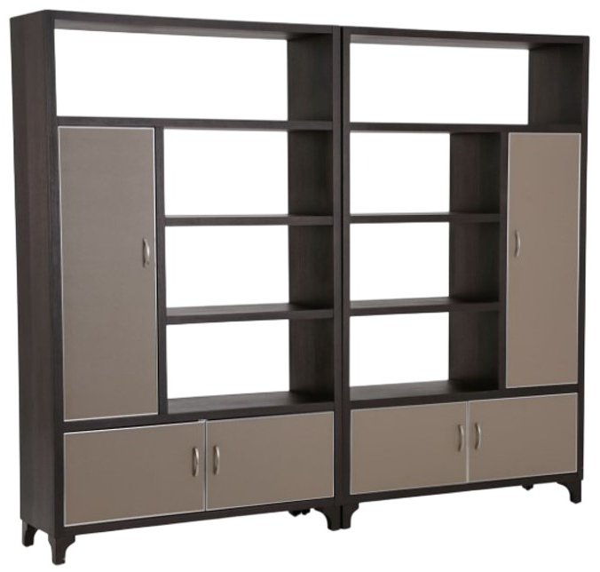 The Michael Amini® 21 Cosmopolitan™ 2-Piece Bookcase features a pebble-grain taupe/umber finish, offering refined style and practicality. With six doors and eight shelves, it provides ample space for storage and display. The sleek design and elegant materials make it a sophisticated choice for living rooms, home offices, or libraries.Read More