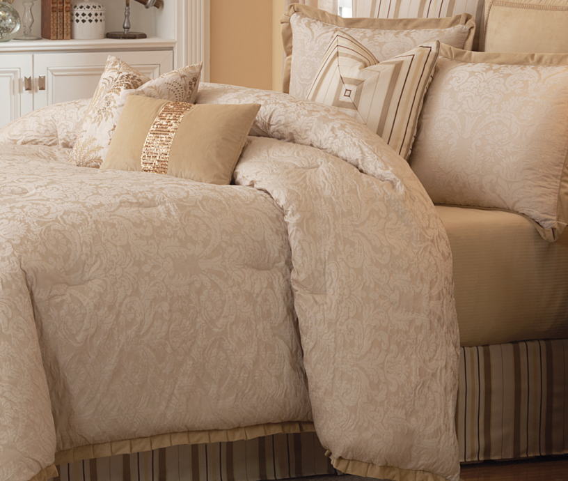 Enjoy the height of traditional style with Carlton. A beautiful custom jacquard fabric is designed to complement the delicately pleated velvet accents. Coordinated with an eye-catching adjustable bed skirt with an 18" drop plus 3 decorative pillows, one with gold sequin accents, this bedding set is made to look and feel like luxury.Read More