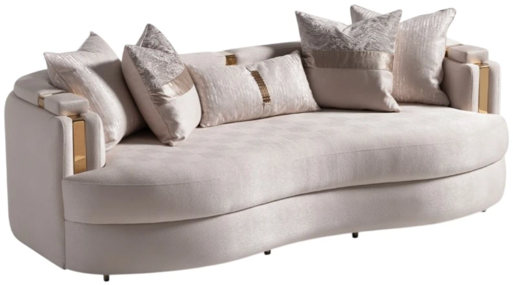 The perfect embodiment of understated elegance and romantic charm. Covered in a subtle jacquard fabric and accented with titanium gold metal band arms, this sofa exudes sophistication and style. The plush velvet piecing and metal chain accent pillows add a luxurious touch, inviting you to sink into comfort and indulge in relaxation.Read More