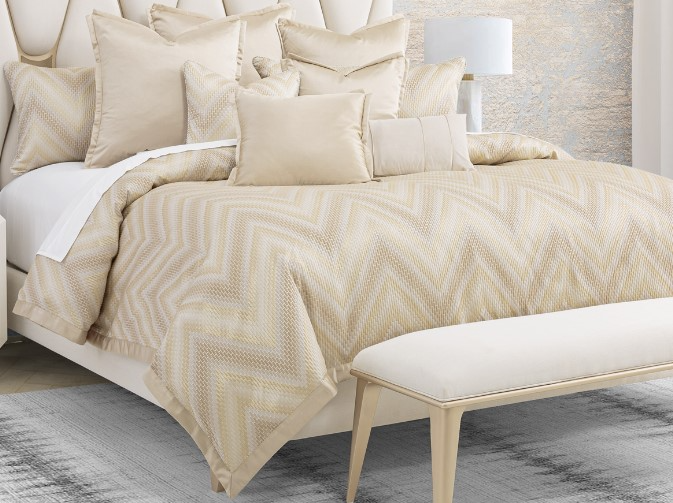Glowing with glamor the Infinity duvet set is crafted with ultimate luxury in mind. Framed with a solid gold band on the duvet, this bedding look reflects today's modern homes and a range of textures that create depth and balance within the set.Read More