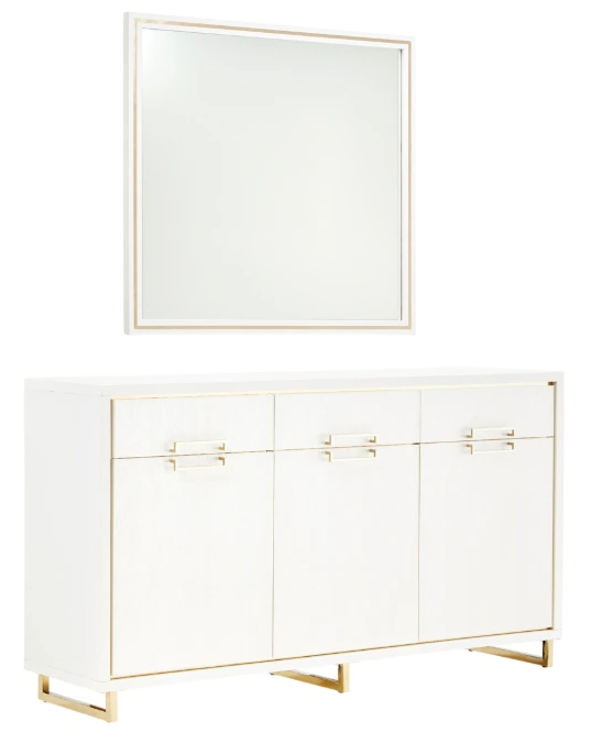 Elevate your space with the Palm Gate cloud white sideboard and mirror. Featuring gold-tone accents and ample storage, this ensemble blends elegance and function, making it a sophisticated addition to dining or living areas.Read More
