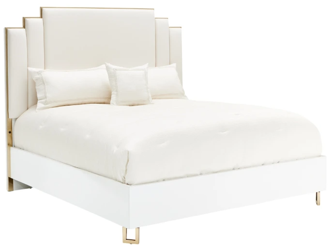 Bask in Palm Gate cloud white upholstered eastern king bed. Its unique headboard, with gold alloy framing, chic channeled upholstery, and a glossy acrylic bed frame and golden legs, create a timeless sleep sanctuary. Beyond its beauty lies convenience – USB 2.0 ports are on each side of the bed.Read More