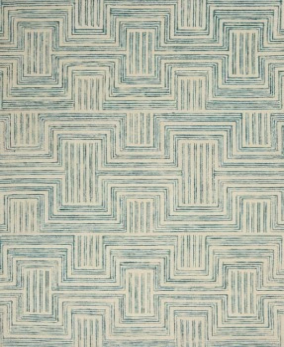 Enliven your living room, dining room, bedroom or other favorite space with the modern graphics of this Interlock area rug. Its rhythmic, space-dyed design commands attention in a stunning ivory and turquoise colorway. With hand-tufted loop pile for superb softness in a low-shed, easy care rug.Read More
