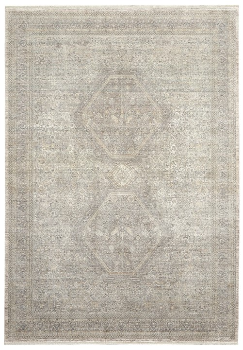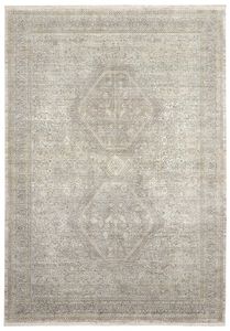 Elaborate design with narrow ornamental border and center medallions on a traditional pattern with faded patina for a vintage look. Cream and faded grey threads blend seamlessly on this versatile, Persian style area rug. Silky to the touch and pleasing to the eye, in a soft, inviting pile.Read More