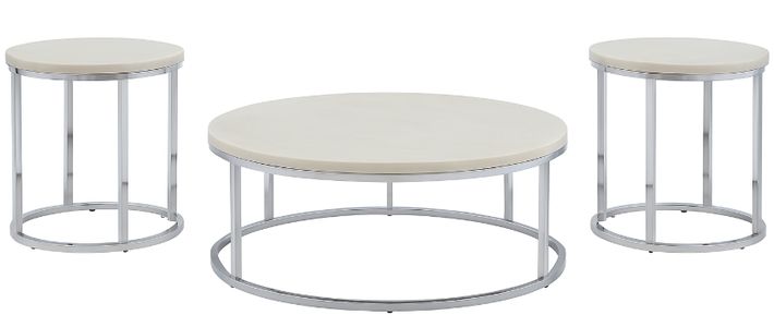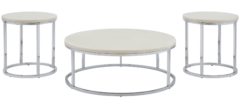 Styling details include soft round shapes with white marble tops and chrome bases give tables a soft contemporary feel that will add sparkle to any room