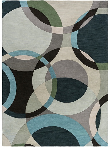A hand-tufted rug in shades of blue, green, and neutrals, with a circular pattern.