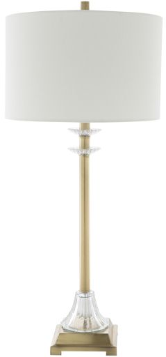The Surya Peralta Antiqued Table Lamp features a textured glass and metal body, white linen shade, and 3-way switch.Read More