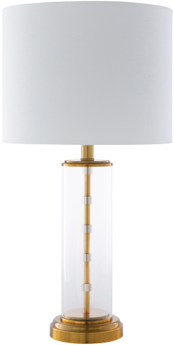 The Perdida Lamp features metallic - brass two-toned glass body, white linen shade, antiqued metal base, and a metal finial.Read More