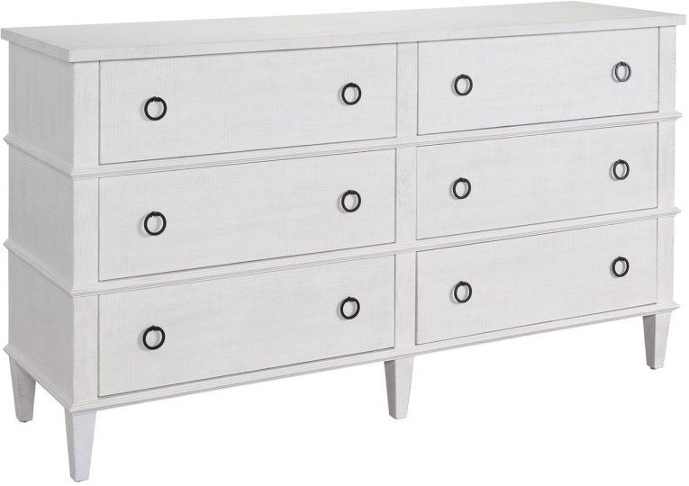 Boasting six spacious drawers accented by ring pull hardware, the Six Drawer Dresser showcases a chicly rustic appeal with delicate etched detailing and a clean off-white finish.Read More