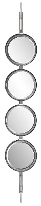 Contemporary in style, this mirror features a sleek iron base with linear metal accents. The piece is finished in silver leaf with four round beveled mirrors. Group multiple pieces together and hang horizontal or vertical to create a truly unique wall feature.Read More