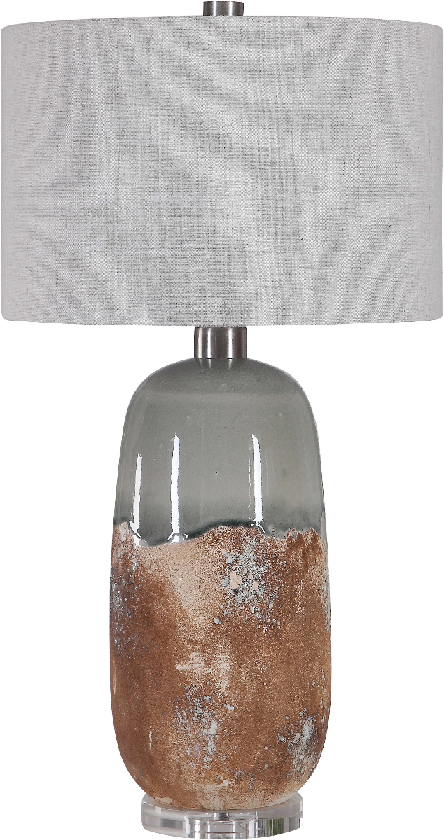 This table lamp features a ceramic base finished in an earthy terracotta rust that transitions into a crackled green gray glaze, accented with brushed nickel plated details and a thick crystal foot. The hardback drum shade is a warm gray linen fabric with natural slubbing.