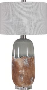 This table lamp features a ceramic base finished in an earthy terracotta rust that transitions into a crackled green gray glaze, accented with brushed nickel plated details and a thick crystal foot. The hardback drum shade is a warm gray linen fabric with natural slubbing.Read More