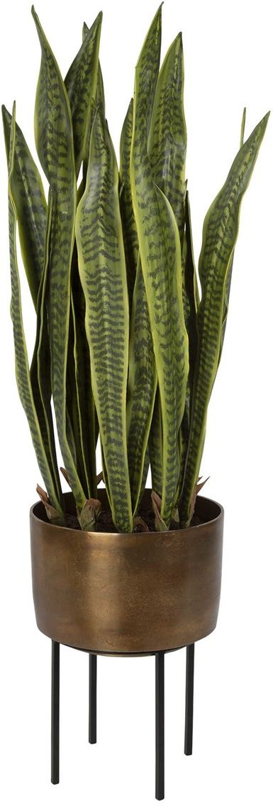 Accent your space with this life-like snake plant, featuring a contemporary antique brass pot nested in a matte black metal stand. Stand is a separate piece and allows for the pot to be displayed directly on a surface.Read More