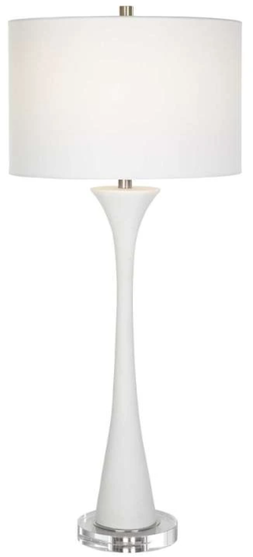 Showcasing a classic trumpet shape, this buffet lamp is handcrafted from ivory man-made stone that accurately replicates the look of Thassos marble, displayed on a thick crystal foot, paired with brushed nickel plated accents. A white fabric shade completes the piece.Read More