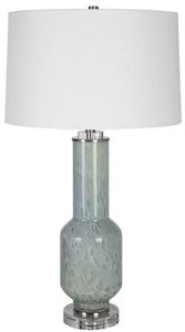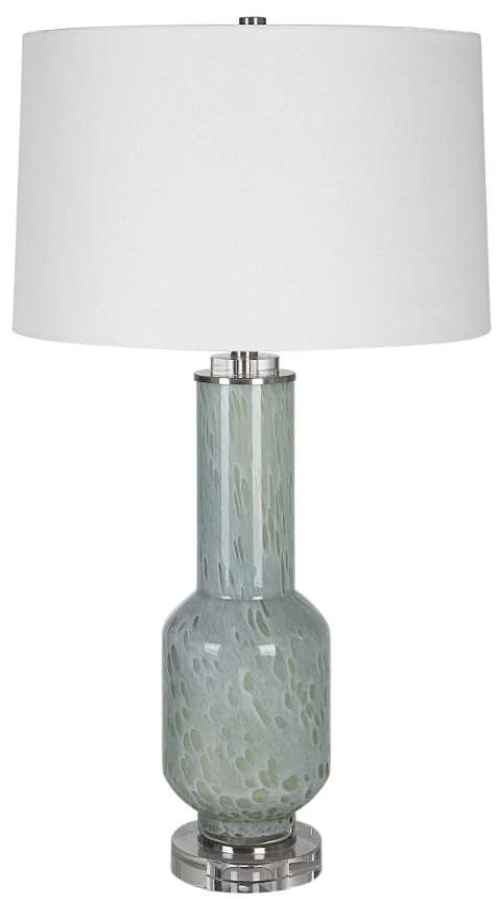This sophisticated lamp displays a unique bubble glass base in tranquil aqua gray with plated brushed nickel accents and thick crystal details. Tapered hardback shade is covered in a crisp white linen fabric.Read More