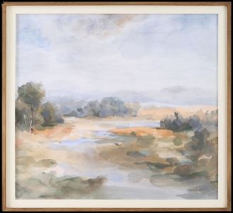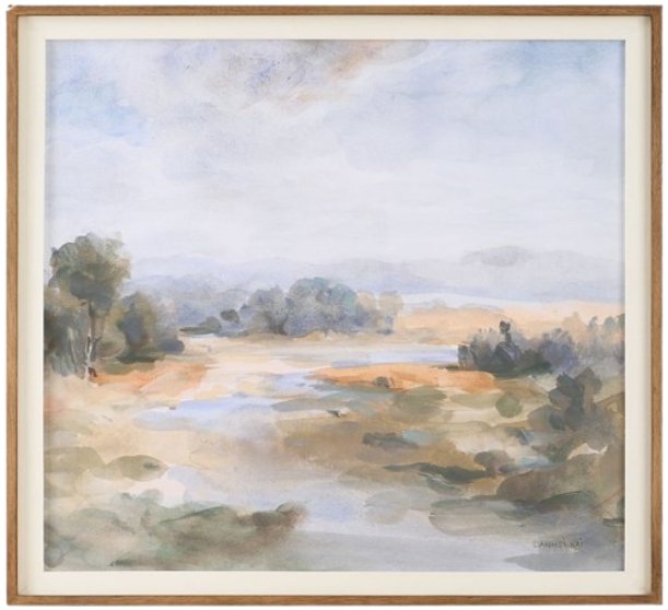 River Afternoon Framed Print captures a serene river landscape in shades of pastel blue, olive and rust, encased in a warm chestnut frame accented by an off-white linen liner. Artwork by Danhui Nai.Read More
