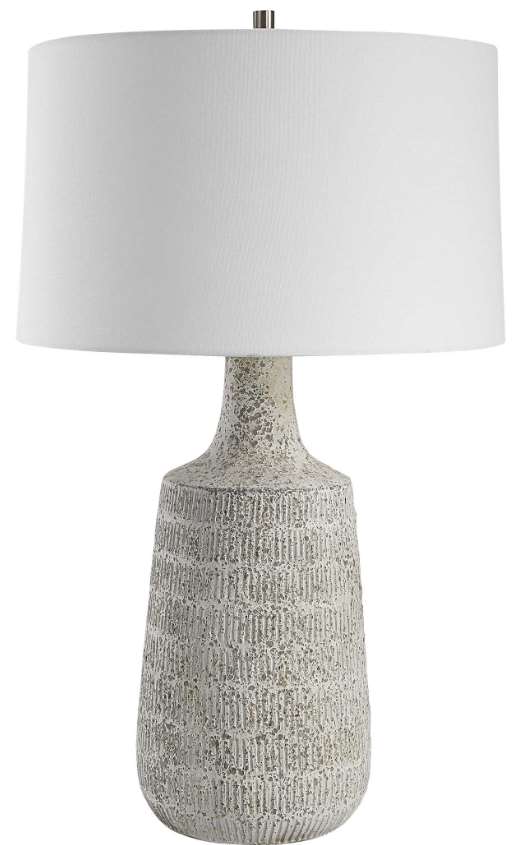 Drawing inspiration from antique clay pottery, this table lamp is handcrafted from ceramic in a mottled gray and off-white matte glaze with subtle carved details. Steel accents are finished in brushed nickel. The hardback drum shade is covered in a casual white fabric.Read More