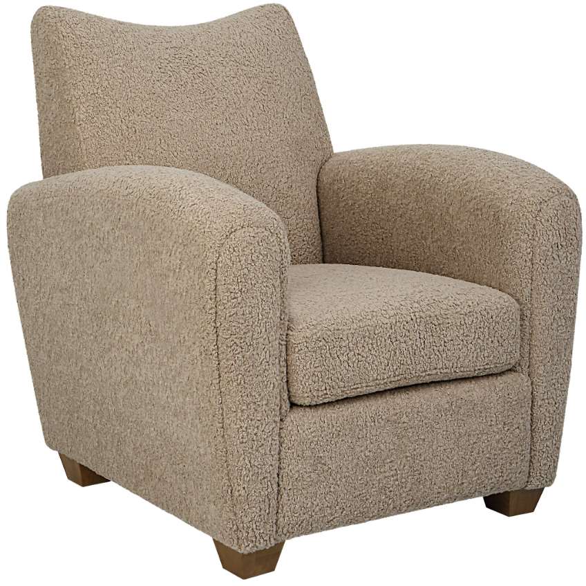 With its curved track arms and supportive back, this cozy accent chair is the perfect balance of comfort and style. Fully upholstered in a soft latte-toned faux shearling and accented by walnut-stained wooden feet.Read More