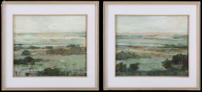 Warm Valley Framed Prints depict a lush valley in rich shades of green and warm tans. Featuring a natural oak veneer frame accented by matching fillets. Each print is accented by an off white linen mat and placed under protective glass. Artwork by Ethan Harper.Read More