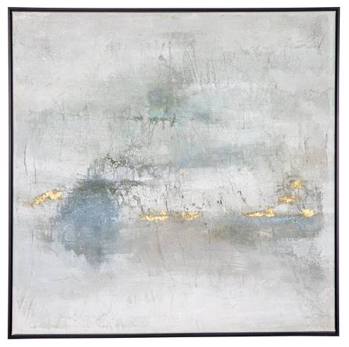 This abstract hand-painted wall art enhances a spirit of relaxation and movement. It features free-floating blues and greys with a touch of golden accents. This wall decor will compliment a modern-styled home or office.Read More