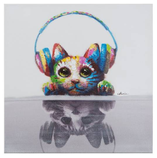 This painting is perfect for a quirky home adornment or fun gift. An adorable cat with large gazing eyes looks content listening to music with headphones on its ears. The use of several colors on the cat against a grey background makes this painting unique and delightful. Bring home this one-of-a-kind piece of artwork today.Read More